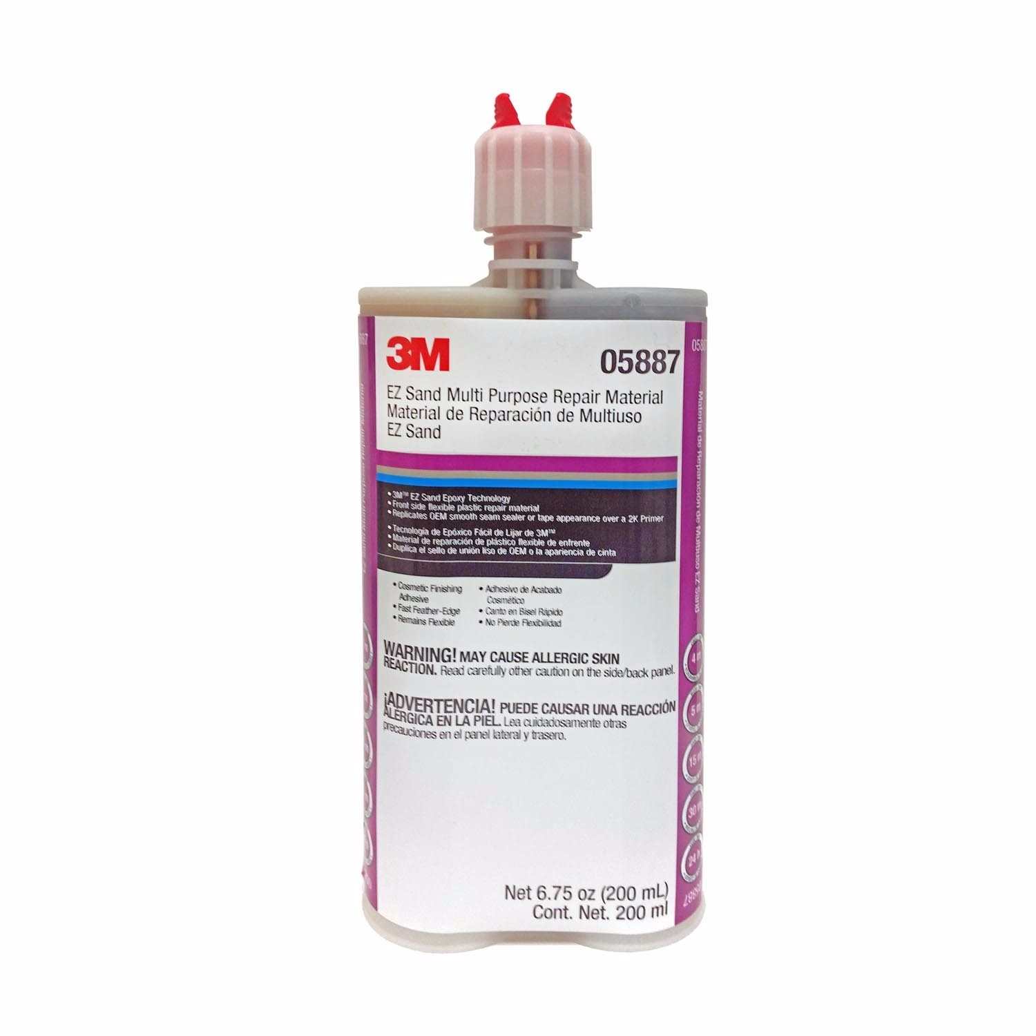 Adhesivo de dos componentes de epóxido que se usa para reparar las piezas de plástico más flexibles, incluyendo cubiertas de defensas y otros plásticos en paneles de carrocerías. Este producto NO se debe usar con SMC - hoja de compuesto moldeado y FRP - fibra de vidrio automotríz. Este producto es fácil de lijar y formulado para excelente alisado de bordes.Un adhesivo de epóxido para acabado, de dos componentes, de alto rendimiento y flexible.Es usado para reparar la mayoría de los plásticos flexibles, incluyendo cubiertas para defensas y otros plásticos en paneles de carrocería. Este producto es fácil de lijar y formulado para excelente alisado de bordes.Se usa con la pistola aplicadora manual superior de 200 ml, 08117, la boquilla estática de mezcla 08193 ó la boquilla estática de mezcla 08194, y el promotor de adhesión de poliolefina de 3M 05907.