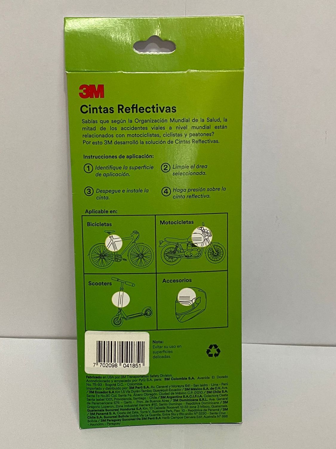 Las Cintas Reflectivas 3M™ son cintas fabricadas en base a material retrorreflectivo Grado Diamante al Cubo (o GD3), tecnología de lámina micro prismática de esquina de cubo completa. Este producto está diseñado para ser instalado sobre bicicletas, motocicletas, scooters, patinetas, cascos de motociclistas, bastones y accesorios destinados a hacer visibles y más seguros los usuarios vulnerables de las vías.