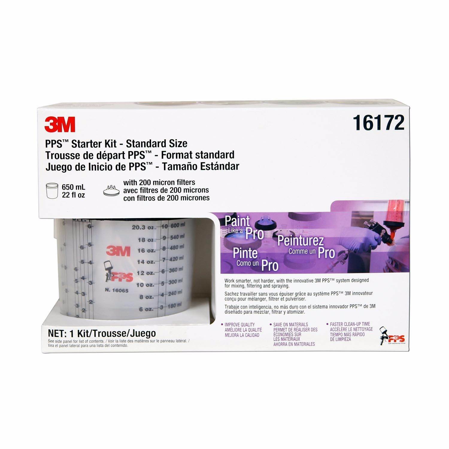Con filtros de 200 micrones. El Juego de Inicio PPS 16172 ofrece una manera económica de comenzar a disfrutar las ventajas del sistema PPS: uso mínimo de disolvente limpiador, aumento de la eficiencia del técnico, reducción del consumo de materiales, reducción del tiempo de cicloLos filtros de 200 micrones son ideales para la mayoría de los sistemas de pintura a base de solvente: primarios, selladores, capa base, y capas transparentes. Por favor refiérase a las recomendaciones del tamaño del filtro de los Fabricantes de Pintura.