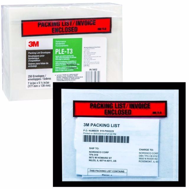 El 3M® Sobre para Lista de Embalaje con Impresión Superior PLE-T4 es un sobre con impresión superior con lista de contenido/factura incluida (fondo rojo con texto negro) con un fuerte adhesivo de resina de caucho. Adhesivo natural de caucho para una adherencia instantánea. Fácil de rasgar, sensible a la presión.